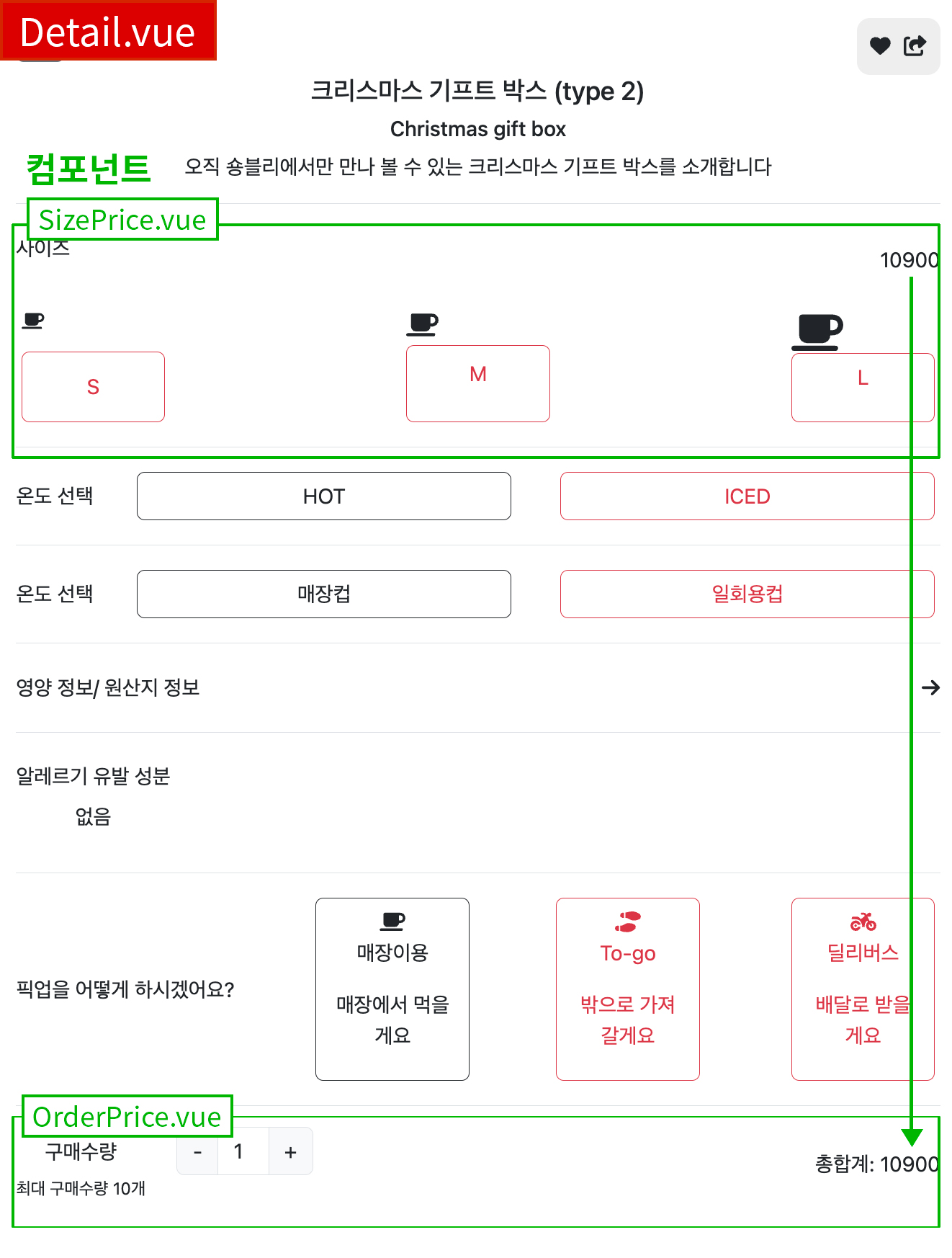 SizePrice.vue에서 데이터에서 받아오는 각 사이즈(S, M, L) 가격을 클릭하면 OrderPrice.vue에 보내주고,