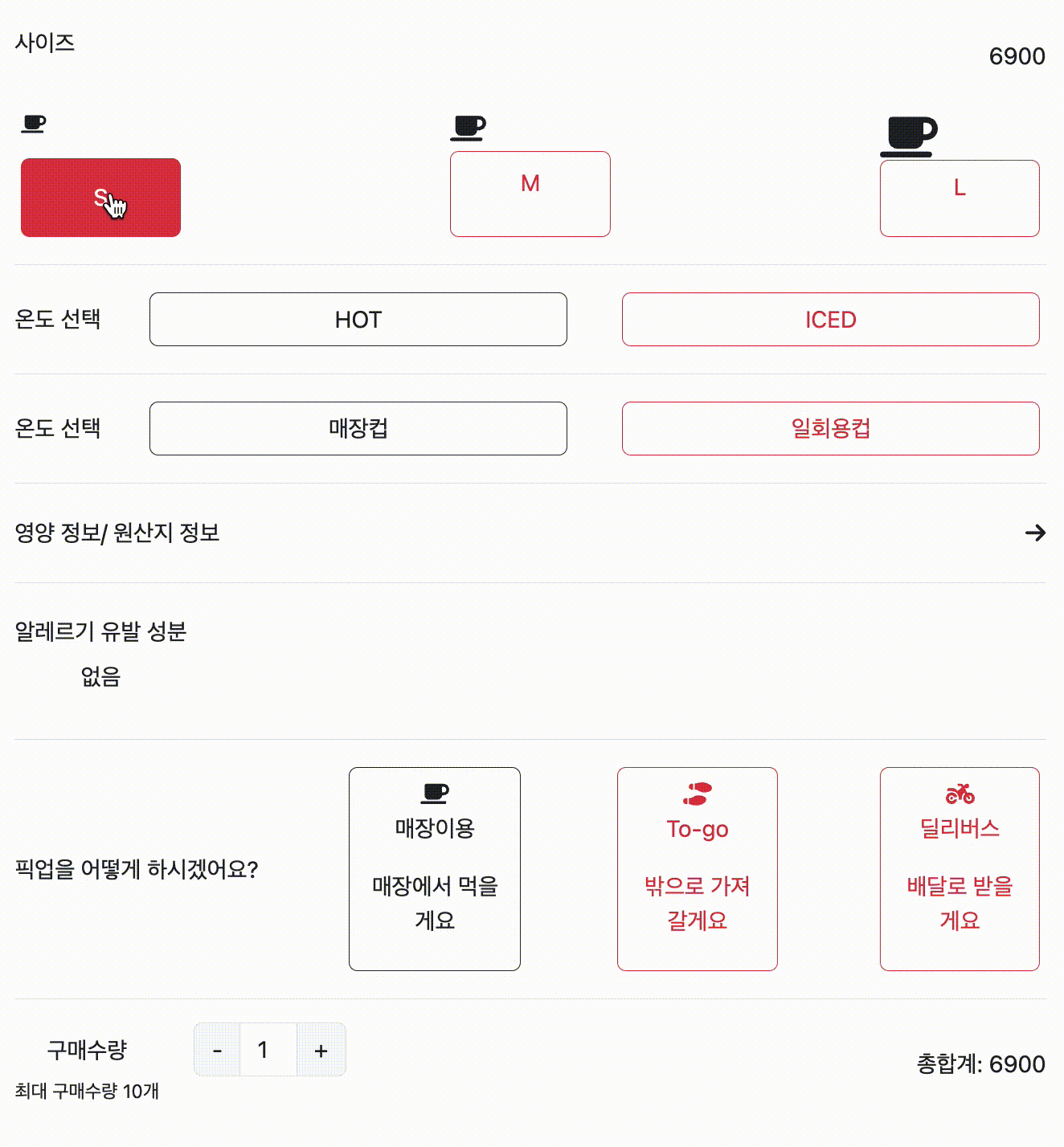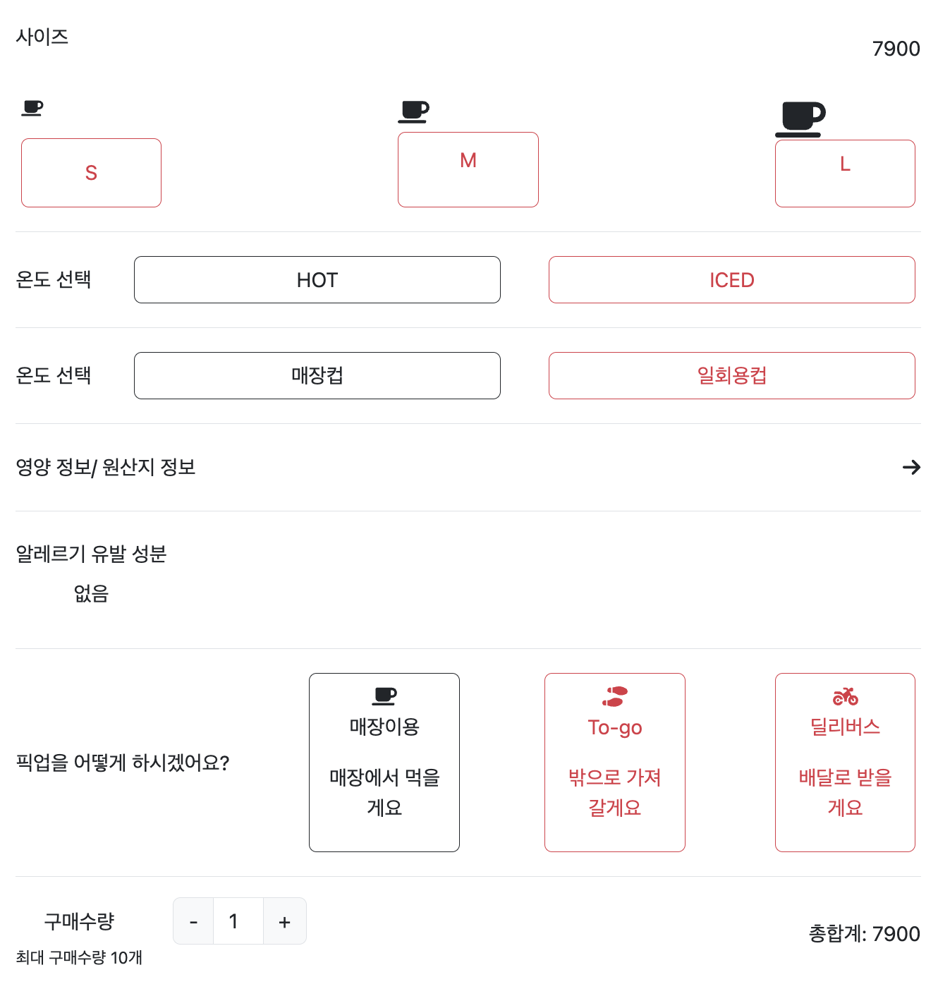 (내가 S사이즈 3잔 주문하다가 M사이즈 1잔 추가하고 싶을 때 수량이 자동으로 1로 초기화 되야 되는데,